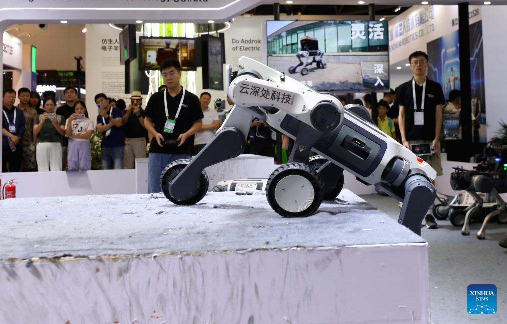 Visitors view a robot dog performing patrol and inspection tasks at the booth of the State Grid Corporation of China at the 2025 World AI Conference (WAIC) in east China's Shanghai, July 29, 2025. The multitude of intelligent robots on display have attracted lots of attention at the 2025 WAIC in Shanghai. Besides the ones that are versed in calligraphy and martial combat, there are also a range of robots adept at performing practical tasks in diverse work and life scenarios. (Xinhua/Chen Haoming)
