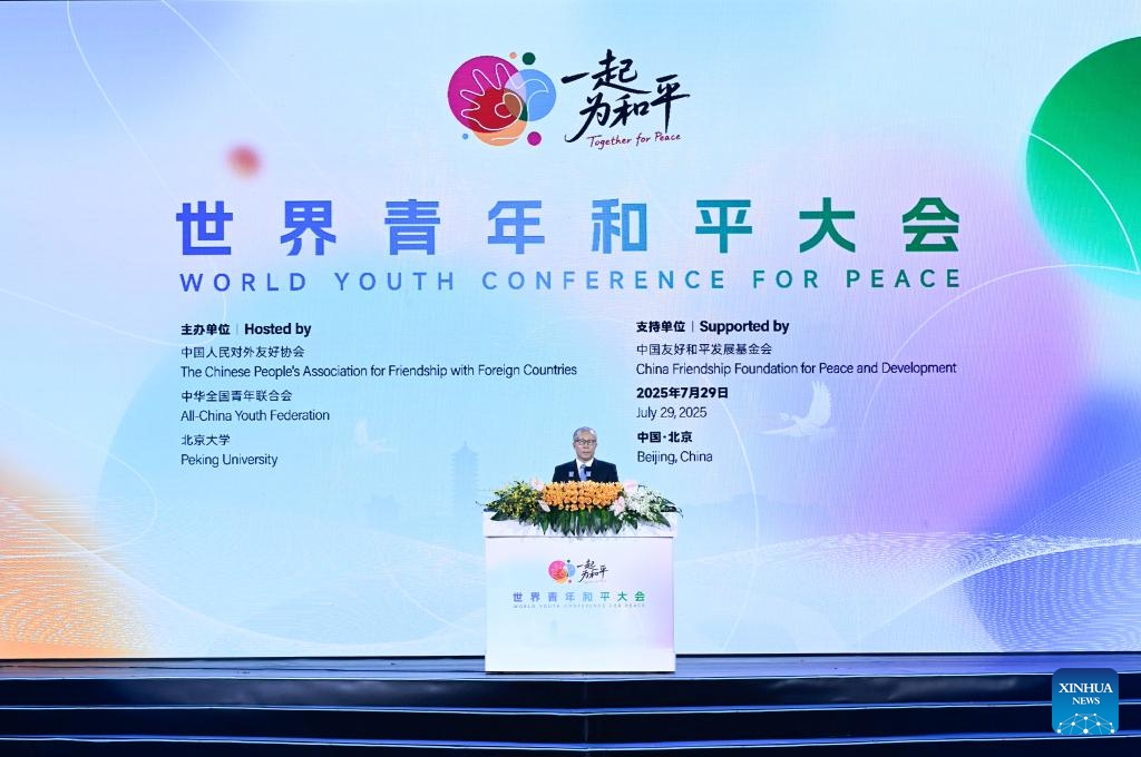 Li Hongzhong, vice chairman of the National People's Congress Standing Committee, also a member of the Political Bureau of the Communist Party of China Central Committee, delivers a message from Chinese President Xi Jinping and makes a speech at the World Youth Conference for Peace in Beijing, capital of China, July 29, 2025. (Xinhua/Shen Hong)