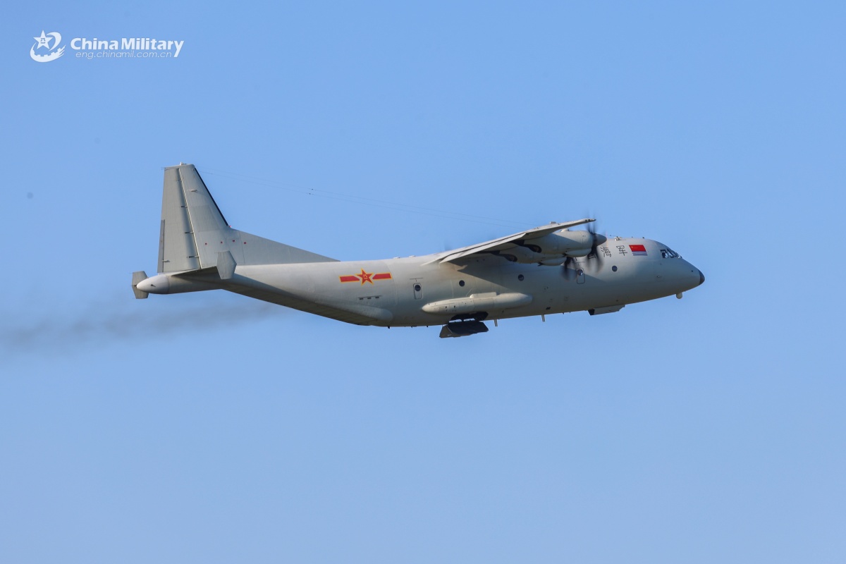 A Y-9 transport aircraft attached to an aviation unit under the Chinese PLA Navy takes off for the designated airspace during a flight training exercise on July 15, 2025. (eng.chinamil.com.cn/Photo by Wang Haojing)