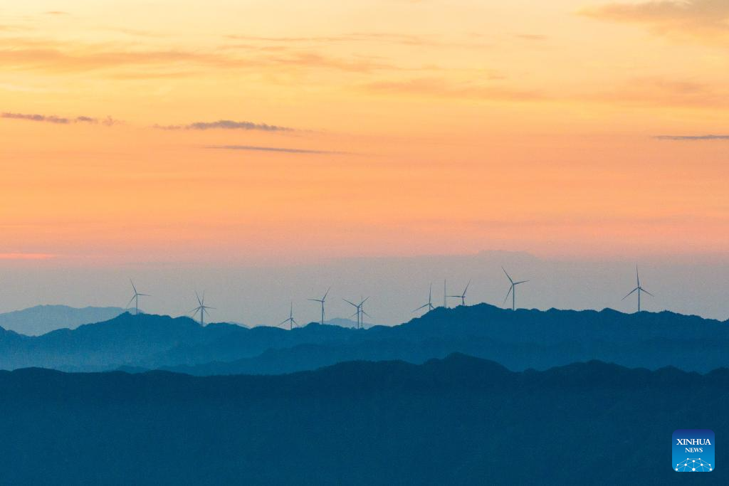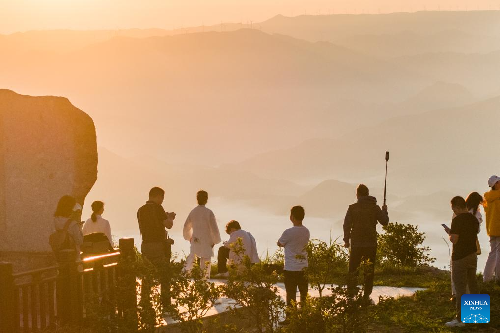 A drone photo taken on July 30, 2025 shows tourists enjoying sunrise scenery at Xuefeng Mountain national forest park in Huaihua City, central China's Hunan Province. (Xinhua/Chen Sihan)