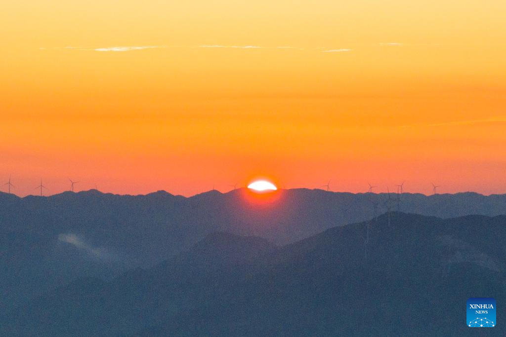 An aerial drone photo taken on July 30, 2025 shows sunrise scenery at Xuefeng Mountain national forest park in Huaihua City, central China's Hunan Province. (Xinhua/Chen Sihan)