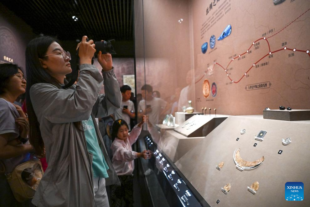 People take photos of exhibits at the Inner Mongolia Museum in Hohhot, north China's Inner Mongolia Autonomous Region, July 30, 2025. (Xinhua/Bei He)