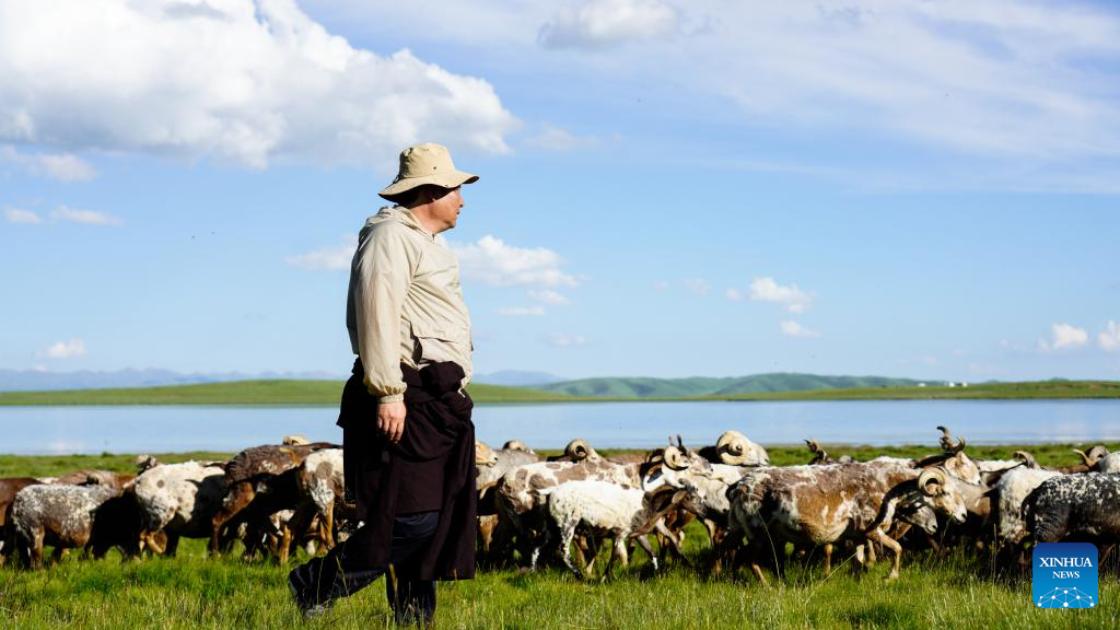 A herdsman looks after his flock on a grassland in Zeku County, Huangnan Tibetan Autonomous Prefecture, northwest China's Qinghai Province, July 30, 2025. (Xinhua/Geng Huihuang)