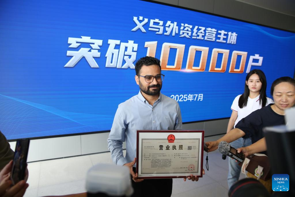 HANGZHOU, July 31 (Xinhua) -- Pakistani businessman Ali Kamran on Thursday received the business license for his company set up in Yiwu, a bustling trade center in east China's Zhejiang Province, with his firm becoming the 10,000th foreign-funded company registered in a city dubbed the "world's supermarket."