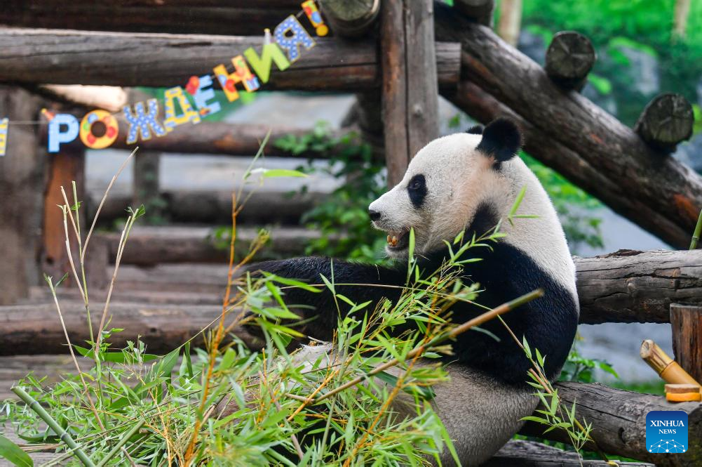 Giant panda Ru Yi eats bamboo at the Moscow Zoo in Moscow, Russia on July 31, 2025. The Moscow Zoo held an event to celebrate giant panda Ru Yi's birthday on Thursday. (Xinhua/Zhang Chaoqun)