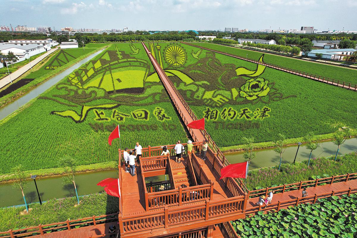 Visitors appreciate a colossal paddy artwork themed on the upcoming Shanghai Cooperation Organization Summit in Huiguan village, Tianjin, on Thursday. The artwork, covering approximately 35 hectares, was unveiled recently. It uses seedlings in five colors — red, yellow, white, purple and green — to blend Tianjin's rich cultural heritage with its beautiful ecological landscape. Tong Yu / China News Service