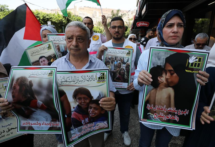 Palestinians participate in a demonstration against the ongoing war in the Gaza Strip and the starvation policy imposed on the residents of Gaza, in the West Bank city of Nablus, on July 29, 2025. (Photo by Nidal Eshtayeh/Xinhua)