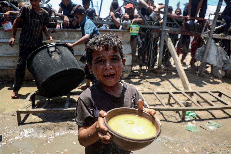 A Palestinian child receives free food from a charity kitchen in Gaza City, on July 24, 2025. (Photo by Rizek Abdeljawad/Xinhua)