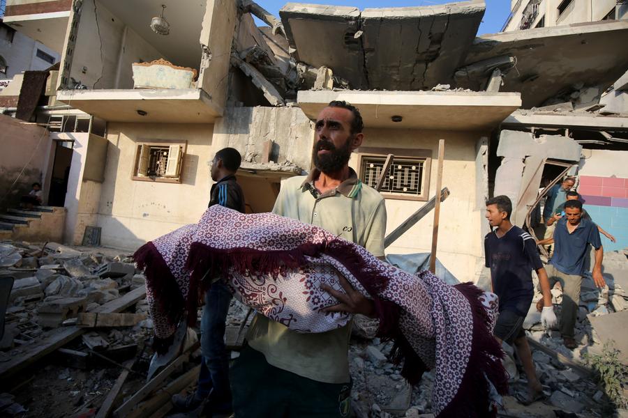 A man carries the body of a victim after an Israeli airstrike in the Tel al-Hawa area, Gaza City, July 23, 2025. (Photo by Rizek Abdeljawad/Xinhua)