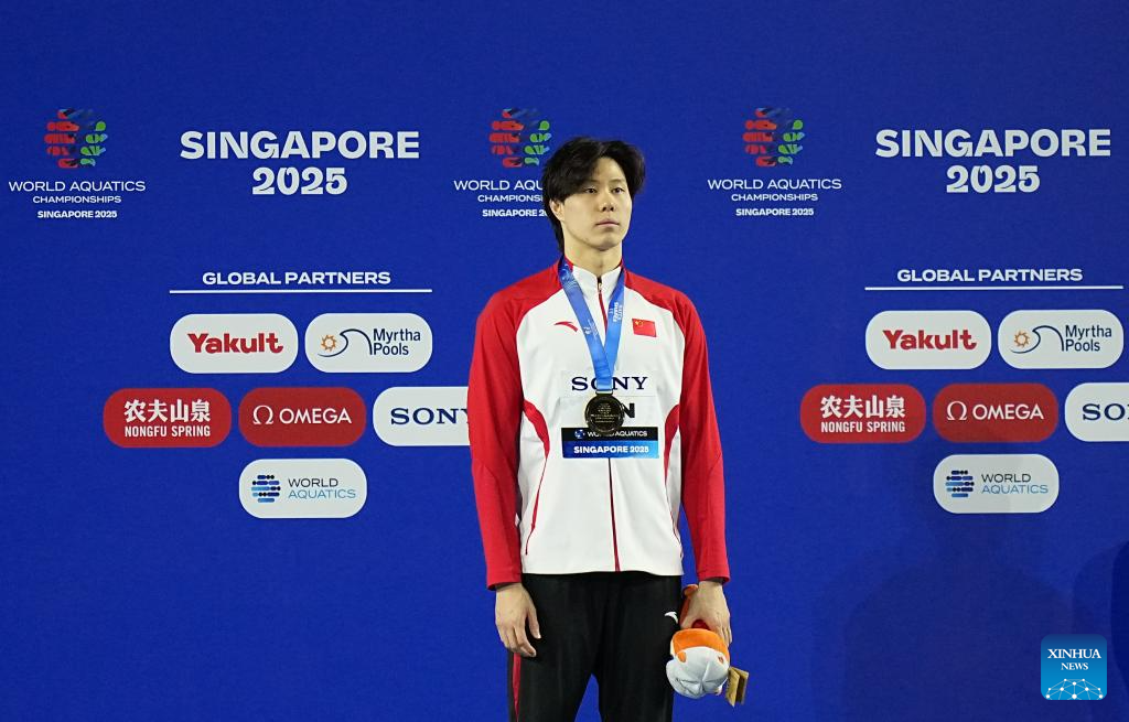 Gold medalist Qin Haiyang of China is seen during the awarding ceremony for the men's 200m breaststroke at the World Aquatics Championships in Singapore, Aug. 1, 2025. (Xinhua/Xia Yifang)