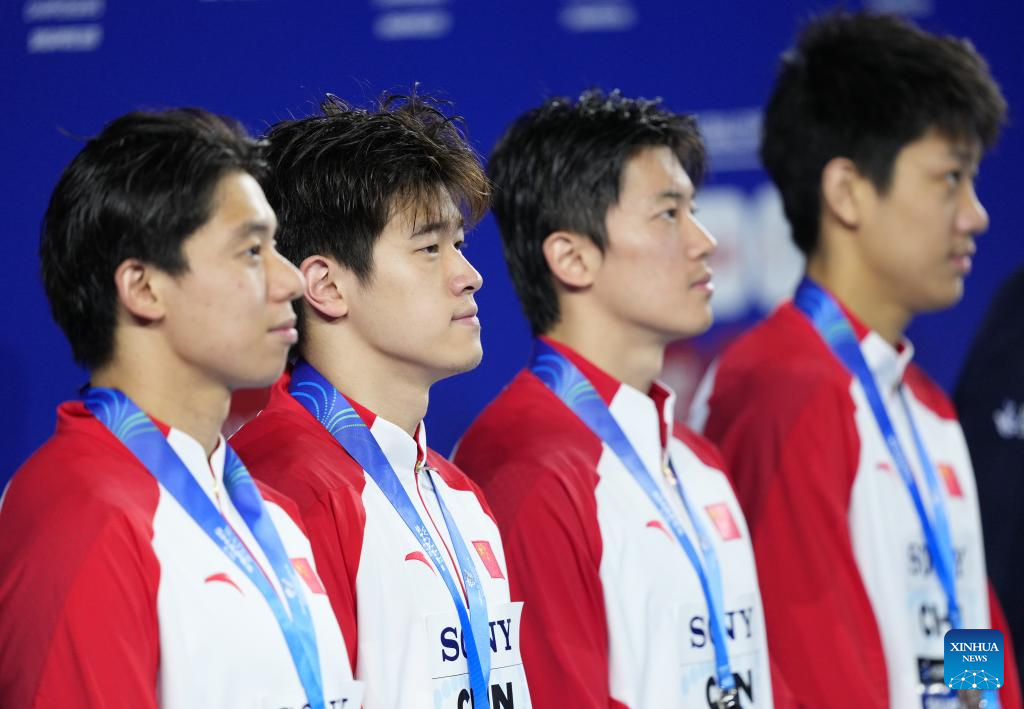 Team China pose during the awarding ceremony for the men's 4x200m freestyle relay at the World Aquatics Championships in Singapore, Aug. 1, 2025. (Xinhua/Wu Zhizun)