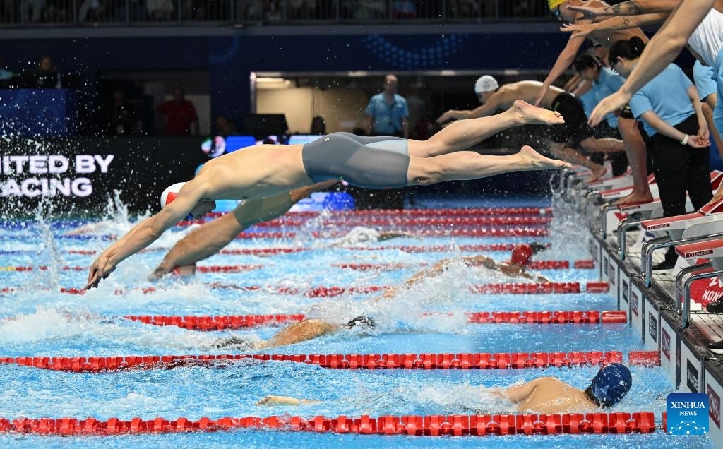 Wang Shun (top) and Pan Zhanle (R) of China compete during the men's 4x200m freestyle relay final at the World Aquatics Championships in Singapore, Aug. 1, 2025. (Xinhua/Xia Yifang)