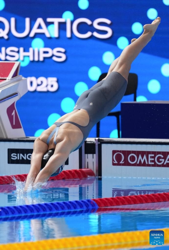 Cheng Yujie of China competes during the women's 100m freestyle final at the World Aquatics Championships in Singapore, Aug. 1, 2025. (Xinhua/Wu Zhizun)