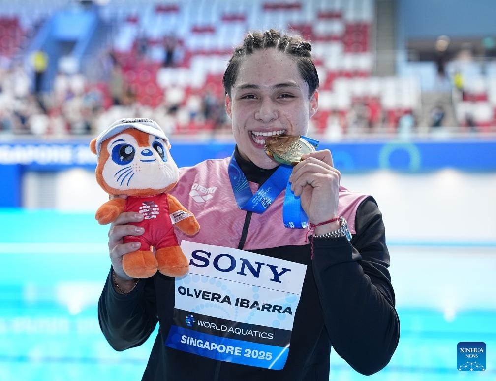 Gold medalist Osmar Olvera Ibarra of Mexico poses after the awarding ceremony for the men's 3m springboard of diving at the World Aquatics Championships in Singapore, Aug. 1, 2025. (Xinhua/Xue Yuge)
