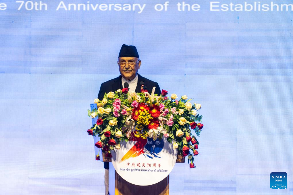 Nepali Prime Minister KP Sharma Oli speaks at a reception marking the 70th anniversary of diplomatic ties between Nepal and China in Kathmandu, Nepal, on Aug. 1, 2025. Nepal values the "time-tested friendship" with China and looks forward to further advancing bilateral relations, Nepali Prime Minister KP Sharma Oli said Friday. (Photo by Hari Maharjan/Xinhua)