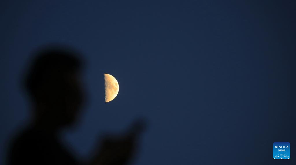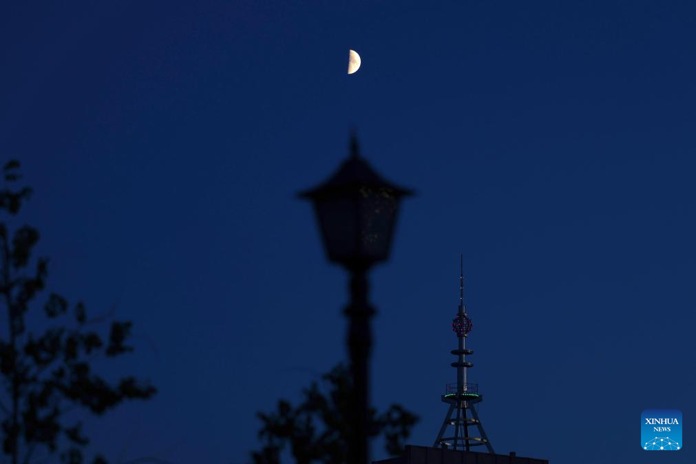 This photo taken on Aug. 1, 2025 shows the first quarter moon in the sky in Harbin City, northeast China's Heilongjiang Province. (Photo by Zhang Shu/Xinhua)