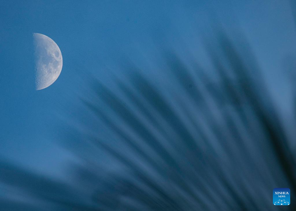 This photo taken on Aug. 1, 2025 shows the first quarter moon in the sky in Qionghai City, south China's Hainan Province. (Photo by Meng Zhongde/Xinhua)
