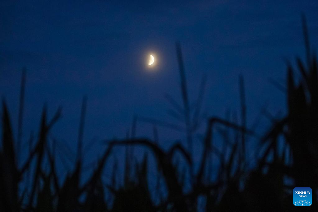 This photo taken on Aug. 1, 2025 shows the first quarter moon in the sky in Jiamusi City, northeast China's Heilongjiang Province. (Photo by Qu Yubao/Xinhua)
