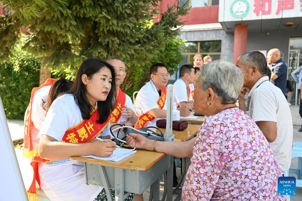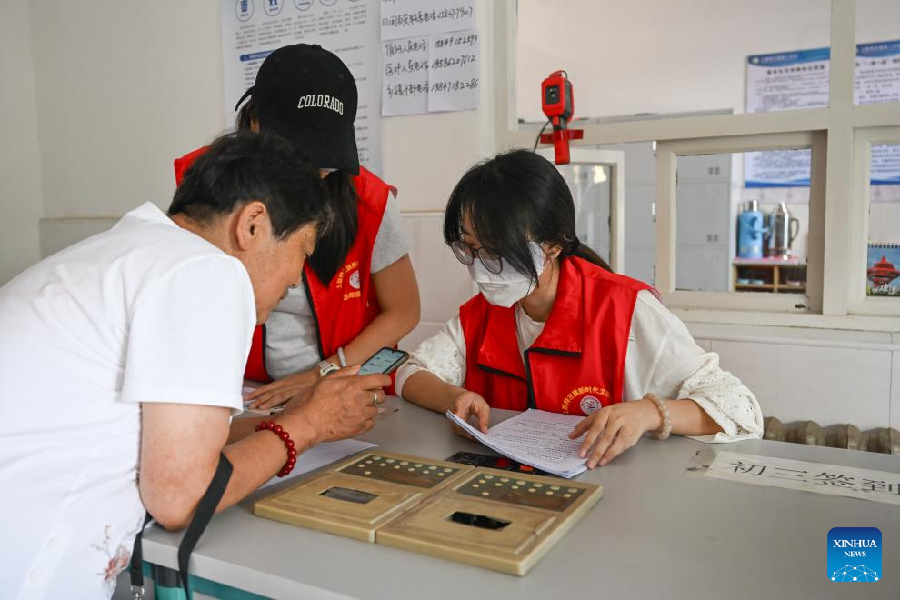 Medical workers (L) offer free consultation services at a temporary shelter in Tumd Left Banner of Hohhot, north China's Inner Mongolia Autonomous Region, Aug. 1, 2025. Recent torrential rains have caused flooding in Tumd Left Banner, resulting in the evacuation of 17,000 residents. Local authorities have set up 22 temporary shelters and provided daily necessities such as beds, food, drinking water, and medicines to flood-affected people. (Xinhua/Bei He)