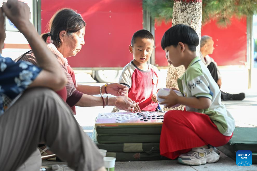 People play Go game, known as Weiqi in Chinese, at a temporary shelter in Tumd Left Banner of Hohhot, north China's Inner Mongolia Autonomous Region, Aug. 1, 2025. Recent torrential rains have caused flooding in Tumd Left Banner, resulting in the evacuation of 17,000 residents. Local authorities have set up 22 temporary shelters and provided daily necessities such as beds, food, drinking water, and medicines to flood-affected people. (Xinhua/Bei He)