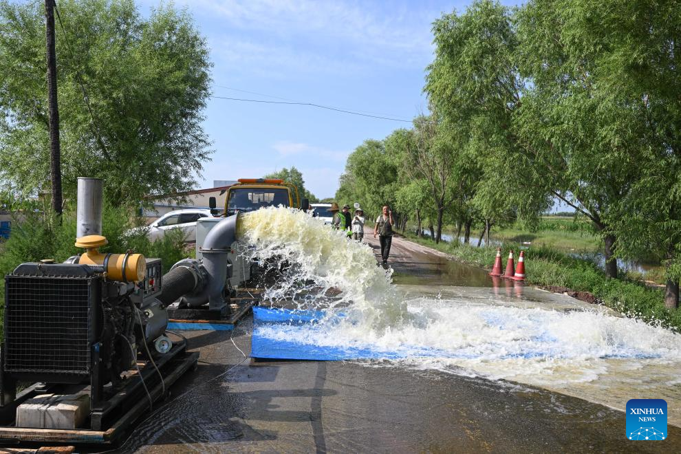 A water pump drains flood water outside a village in Tumd Left Banner of Hohhot, north China's Inner Mongolia Autonomous Region, Aug. 1, 2025. Recent torrential rains have caused flooding in Tumd Left Banner, resulting in the evacuation of 17,000 residents. Local authorities have set up 22 temporary shelters and provided daily necessities such as beds, food, drinking water, and medicines to flood-affected people. (Xinhua/Bei He)