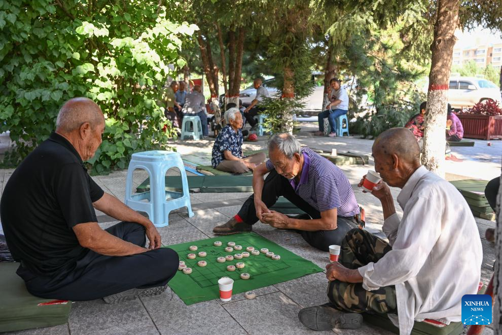 People play Xiangqi, a traditional Chinese board game also known as the Chinese chess, at a temporary shelter in Tumd Left Banner of Hohhot, north China's Inner Mongolia Autonomous Region, Aug. 1, 2025. Recent torrential rains have caused flooding in Tumd Left Banner, resulting in the evacuation of 17,000 residents. Local authorities have set up 22 temporary shelters and provided daily necessities such as beds, food, drinking water, and medicines to flood-affected people. (Xinhua/Bei He)