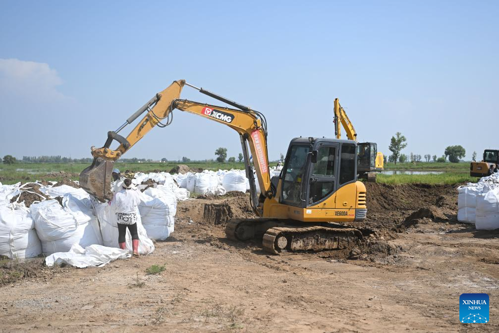 Workers fill sandbags outside a village in Tumd Left Banner of Hohhot, north China's Inner Mongolia Autonomous Region, Aug. 1, 2025. Recent torrential rains have caused flooding in Tumd Left Banner, resulting in the evacuation of 17,000 residents. Local authorities have set up 22 temporary shelters and provided daily necessities such as beds, food, drinking water, and medicines to flood-affected people. (Xinhua/Bei He)