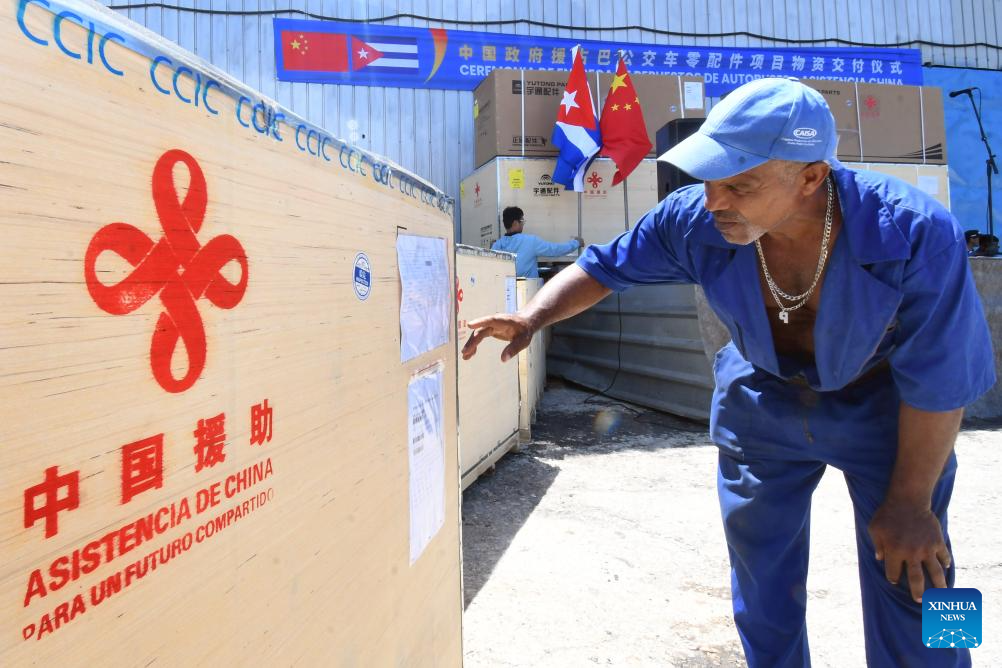 A worker checks bus parts and accessories under a Chinese government assistance project to Cuba for bus repair and rehabilitation in Guanajay, Cuba, on July 31, 2025. The handover ceremony of bus parts and accessories under a Chinese government assistance project to Cuba for bus repair and rehabilitation was held here on Thursday. (Photo by Joaquin Hernandez/Xinhua)