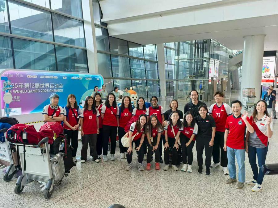 Singapore's floorball team members pose for a photo after arriving at Chengdu Tianfu International Airport for the 12th World Games on Aug. 3, 2025. (Xinhua/Bian Siqi)