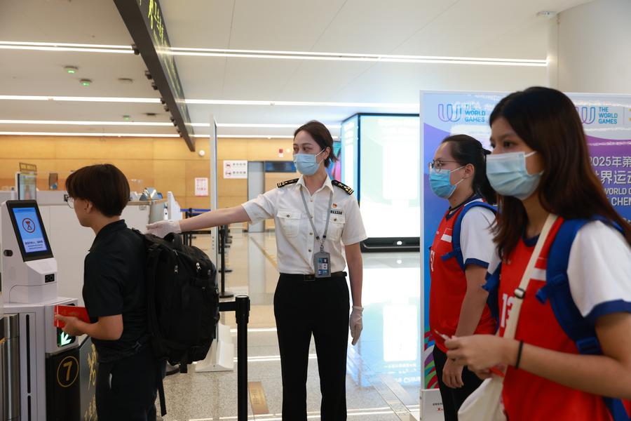 As flight 3U3920 landed at Chengdu Tianfu International Airport in the early morning on Sunday, a group of 30 Singaporean floorball athletes arrived, becoming the first batch of athletes to arrive in the capital city of southwest China's Sichuan Province for the World Games. Also on the same flight were five team officials and an International Federation official. Groups from Switzerland, among others, are also expected to arrive on Sunday.