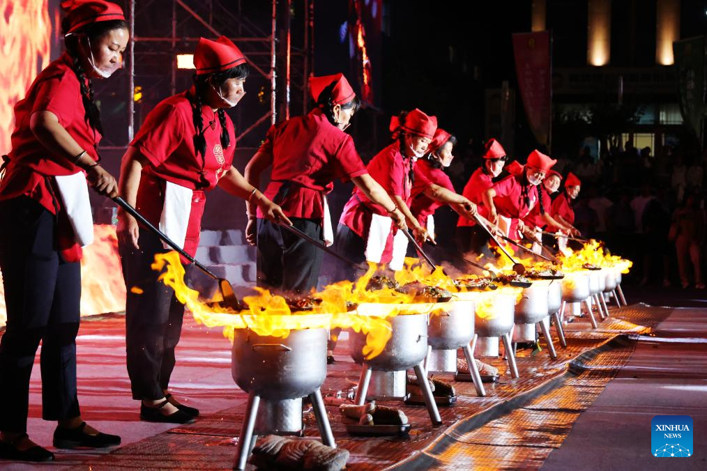 Cooks perform cooking Chaobola, a street food listed as municipal-level intangible cultural heritage, at a food festival in Zhangye, northwest China's Gansu Province, Aug. 2, 2025. (Photo by Cheng Lin/Xinhua)