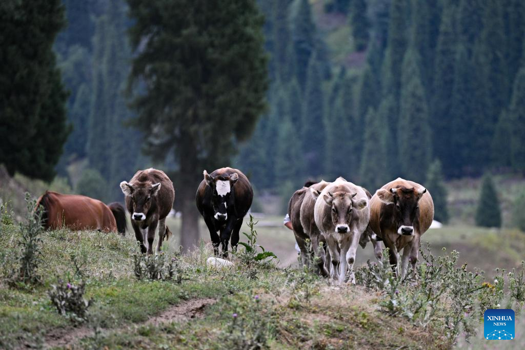 A herd of cattle is pictured at Koldeneng in Gongliu County of Ili Kazak Autonomous Prefecture, northwest China's Xinjiang Uygur Autonomous Region, on Aug. 2, 2025. (Xinhua/Xin Yuewei)