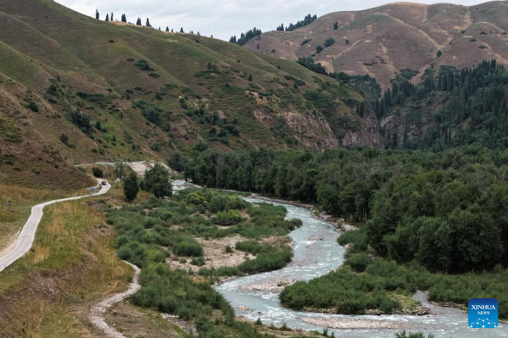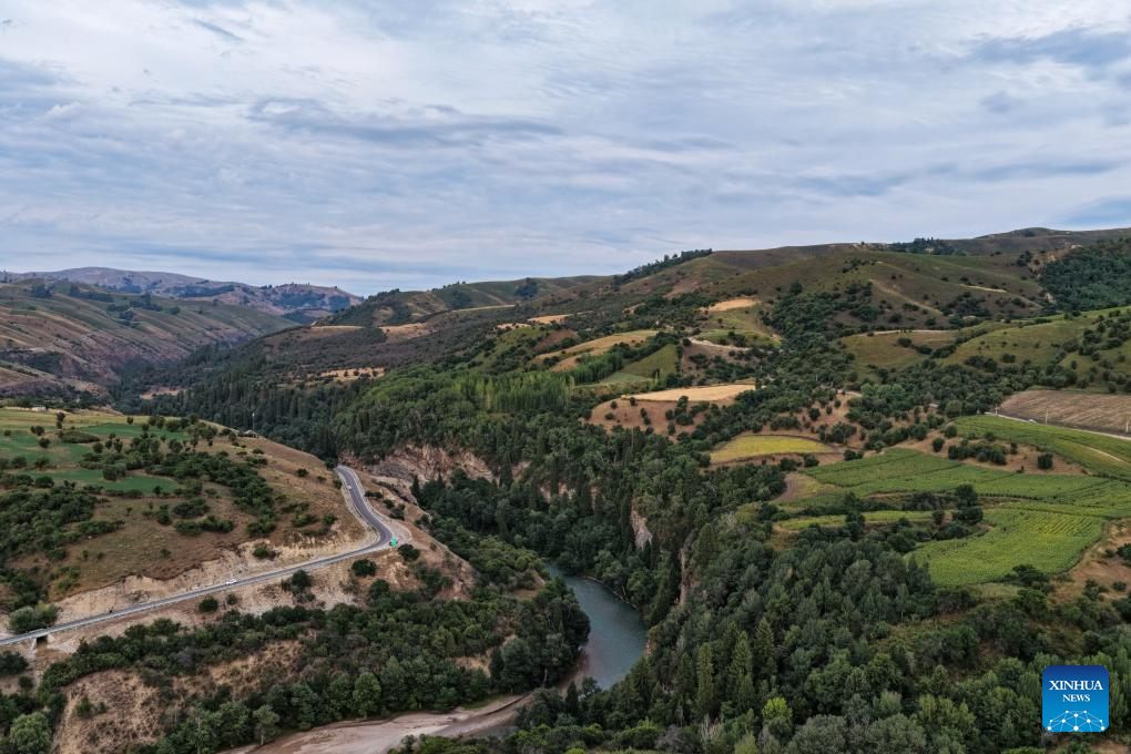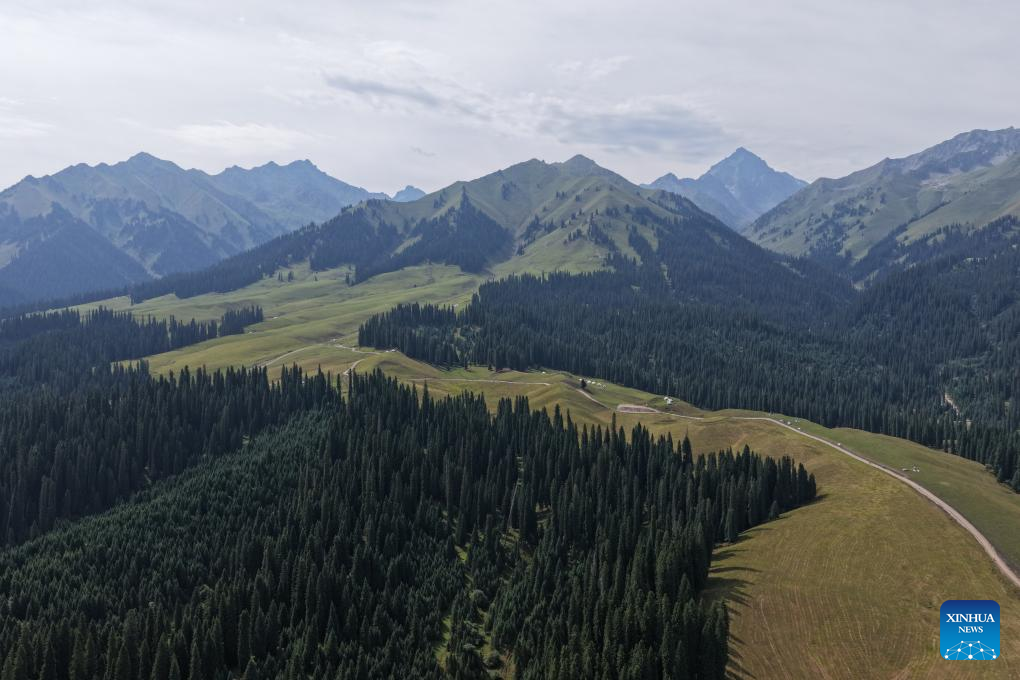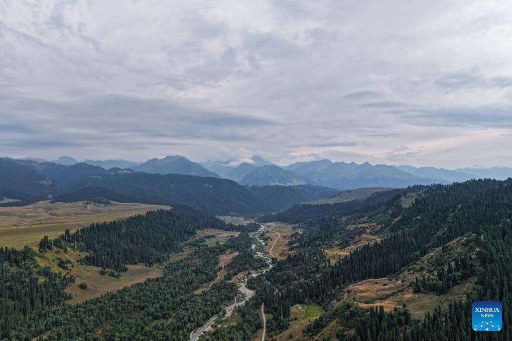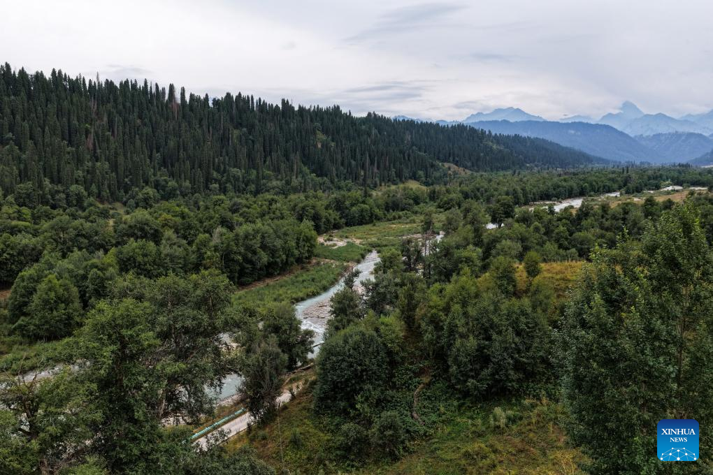 A drone photo taken on Aug. 2, 2025 shows a view of Koldeneng in Gongliu County of Ili Kazak Autonomous Prefecture, northwest China's Xinjiang Uygur Autonomous Region. (Xinhua/Xin Yuewei)