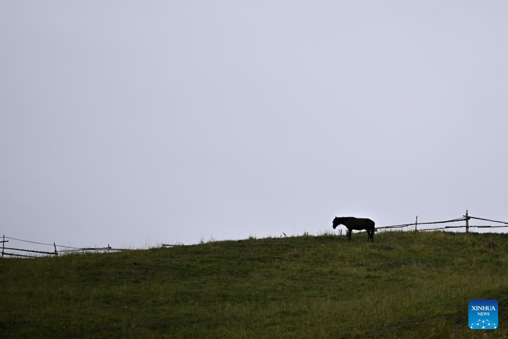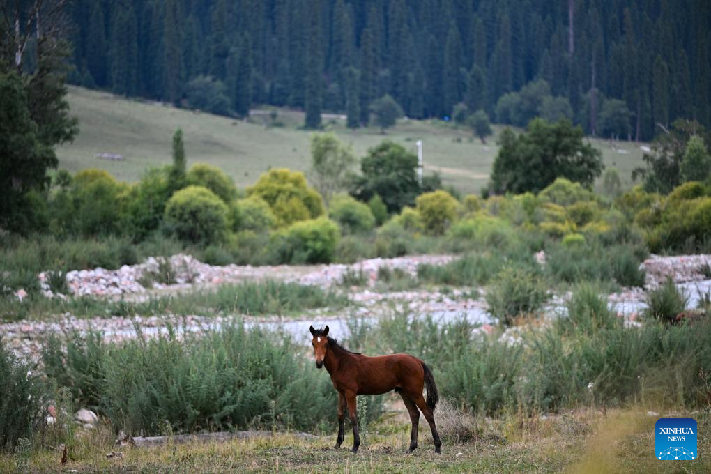 A horse forages at Koldeneng in Gongliu County of Ili Kazak Autonomous Prefecture, northwest China's Xinjiang Uygur Autonomous Region, on Aug. 2, 2025. (Xinhua/Xin Yuewei)