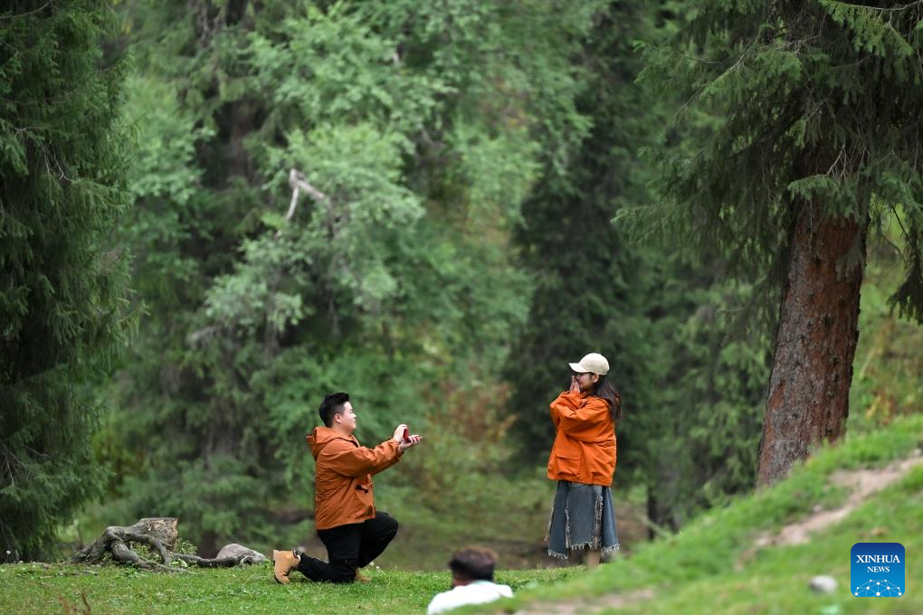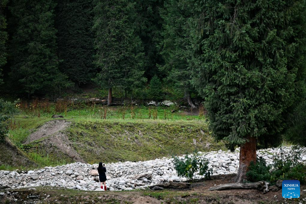 A tourist takes photos at Koldeneng in Gongliu County of Ili Kazak Autonomous Prefecture, northwest China's Xinjiang Uygur Autonomous Region, on Aug. 2, 2025. (Xinhua/Xin Yuewei)