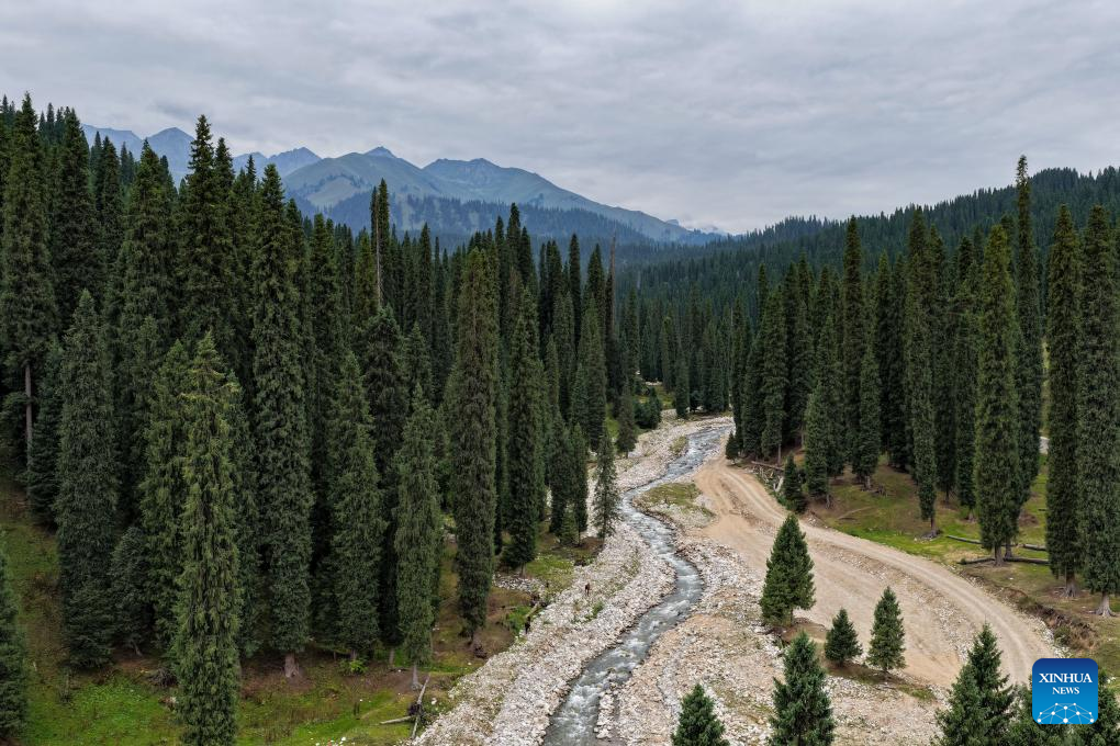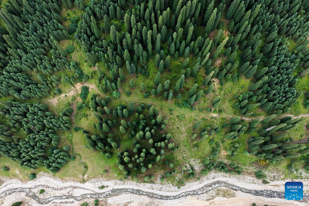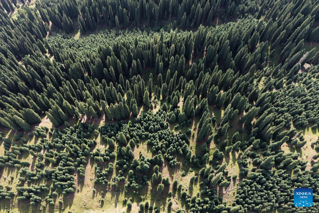 An aerial drone photo taken on Aug. 2, 2025 shows spruce trees at Koldeneng in Gongliu County of Ili Kazak Autonomous Prefecture, northwest China's Xinjiang Uygur Autonomous Region. (Xinhua/Zhao Yusi)