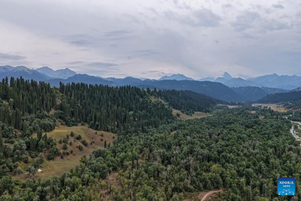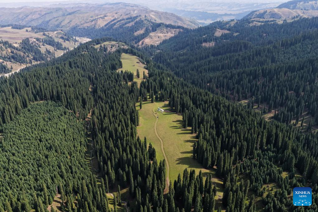 A drone photo taken on Aug. 2, 2025 shows spruce trees at Koldeneng in Gongliu County of Ili Kazak Autonomous Prefecture, northwest China's Xinjiang Uygur Autonomous Region. (Xinhua/Xin Yuewei)
