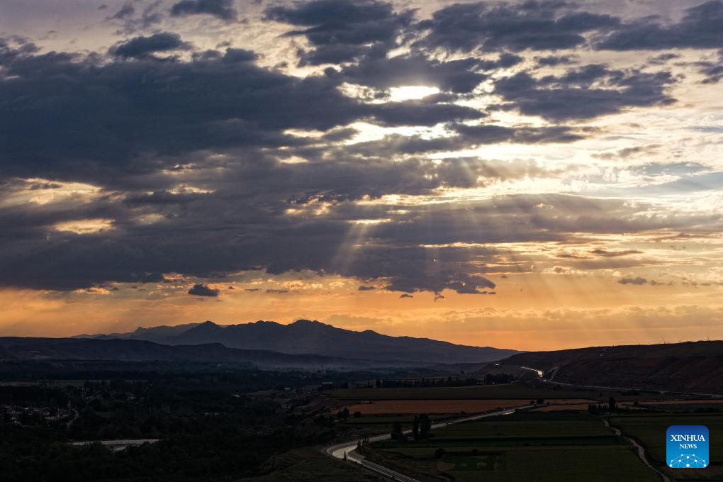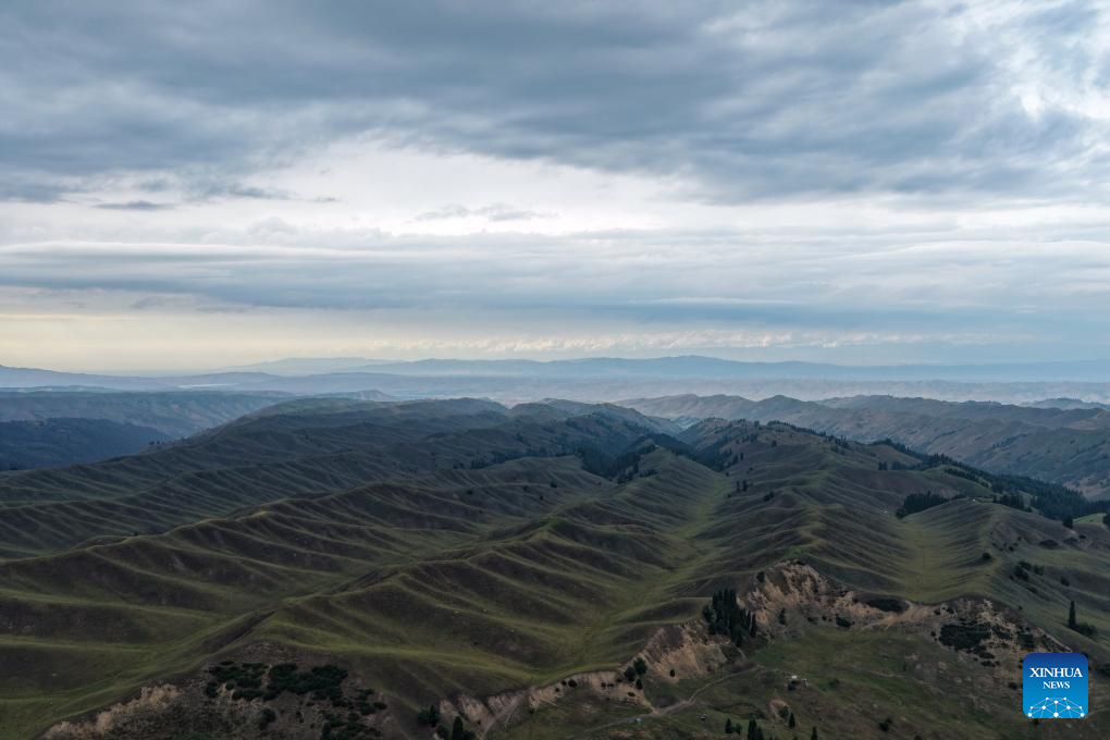 An aerial drone photo taken on Aug. 2, 2025 shows a sunset view of Koldeneng in Gongliu County of Ili Kazak Autonomous Prefecture, northwest China's Xinjiang Uygur Autonomous Region. (Xinhua/Xin Yuewei)