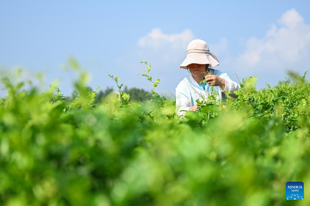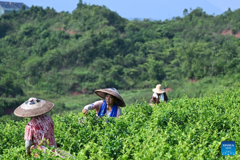 A villager harvests vine tea at a vine tea plantation in Laifeng County of Enshi Tujia and Miao Autonomous Prefecture, central China's Hubei Province, Aug. 2, 2025. Laifeng County has leveraged comprehensive industrial chain development to optimize the business ecosystem for vine tea cultivation. The county has expanded its vine tea plantations to 102,000 mu (about 6,800 hectares), generating an annual output value of 2.253 billion yuan (about 321.4 million U.S. dollars). The industry has lifted household incomes for over 20,000 rural families. (Xinhua/Du Zixuan)