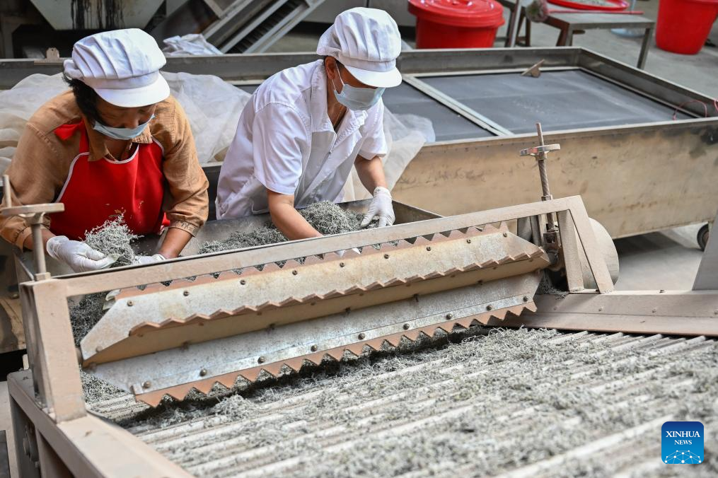 Workers sort vine tea at a workshop in Laifeng County of Enshi Tujia and Miao Autonomous Prefecture, central China's Hubei Province, Aug. 1, 2025. Laifeng County has leveraged comprehensive industrial chain development to optimize the business ecosystem for vine tea cultivation. The county has expanded its vine tea plantations to 102,000 mu (about 6,800 hectares), generating an annual output value of 2.253 billion yuan (about 321.4 million U.S. dollars). The industry has lifted household incomes for over 20,000 rural families. (Xinhua/Du Zixuan)