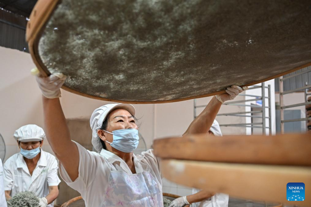 Workers prepare to dry vine tea at a workshop in Laifeng County of Enshi Tujia and Miao Autonomous Prefecture, central China's Hubei Province, Aug. 1, 2025. Laifeng County has leveraged comprehensive industrial chain development to optimize the business ecosystem for vine tea cultivation. The county has expanded its vine tea plantations to 102,000 mu (about 6,800 hectares), generating an annual output value of 2.253 billion yuan (about 321.4 million U.S. dollars). The industry has lifted household incomes for over 20,000 rural families. (Xinhua/Du Zixuan)