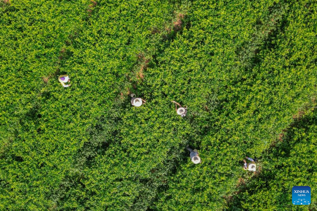 Villagers harvest vine tea at a vine tea plantation in Laifeng County of Enshi Tujia and Miao Autonomous Prefecture, central China's Hubei Province, Aug. 2, 2025. Laifeng County has leveraged comprehensive industrial chain development to optimize the business ecosystem for vine tea cultivation. The county has expanded its vine tea plantations to 102,000 mu (about 6,800 hectares), generating an annual output value of 2.253 billion yuan (about 321.4 million U.S. dollars). The industry has lifted household incomes for over 20,000 rural families. (Xinhua/Du Zixuan)