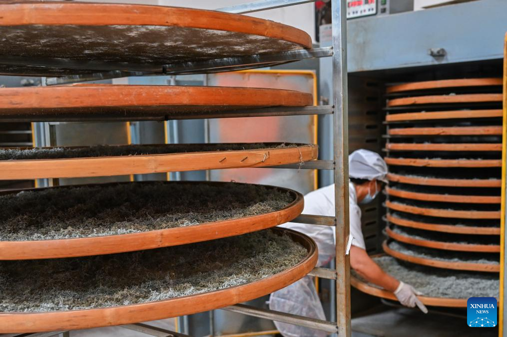 A worker puts vine tea into a drying machine at a workshop in Laifeng County of Enshi Tujia and Miao Autonomous Prefecture, central China's Hubei Province, Aug. 1, 2025. Laifeng County has leveraged comprehensive industrial chain development to optimize the business ecosystem for vine tea cultivation. The county has expanded its vine tea plantations to 102,000 mu (about 6,800 hectares), generating an annual output value of 2.253 billion yuan (about 321.4 million U.S. dollars). The industry has lifted household incomes for over 20,000 rural families. (Xinhua/Du Zixuan)