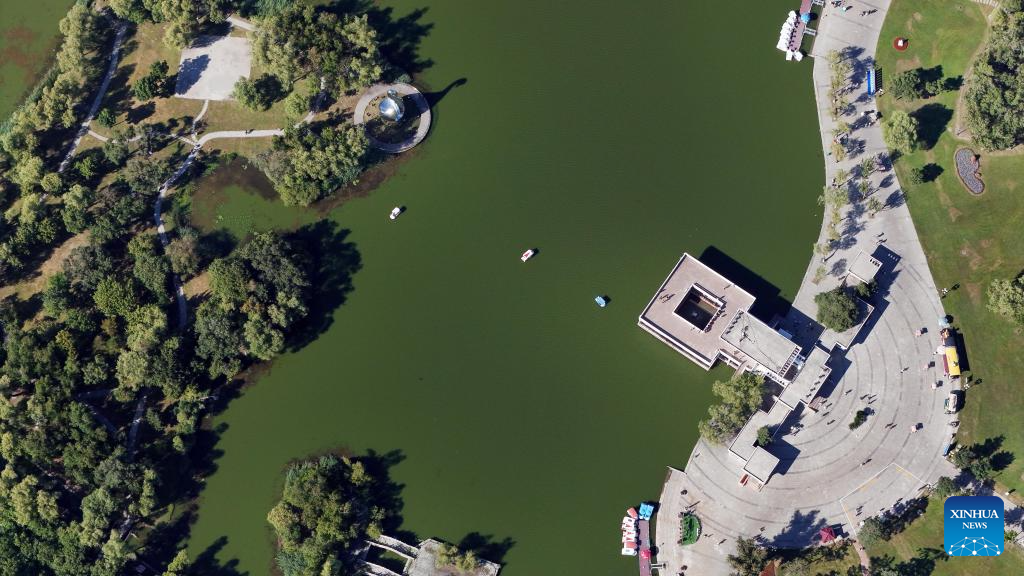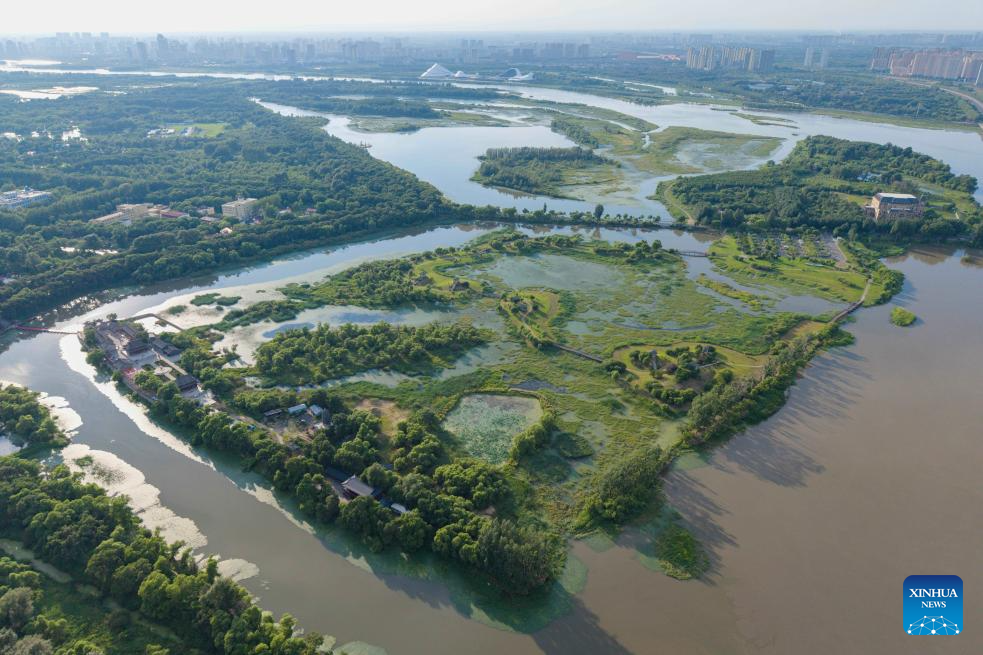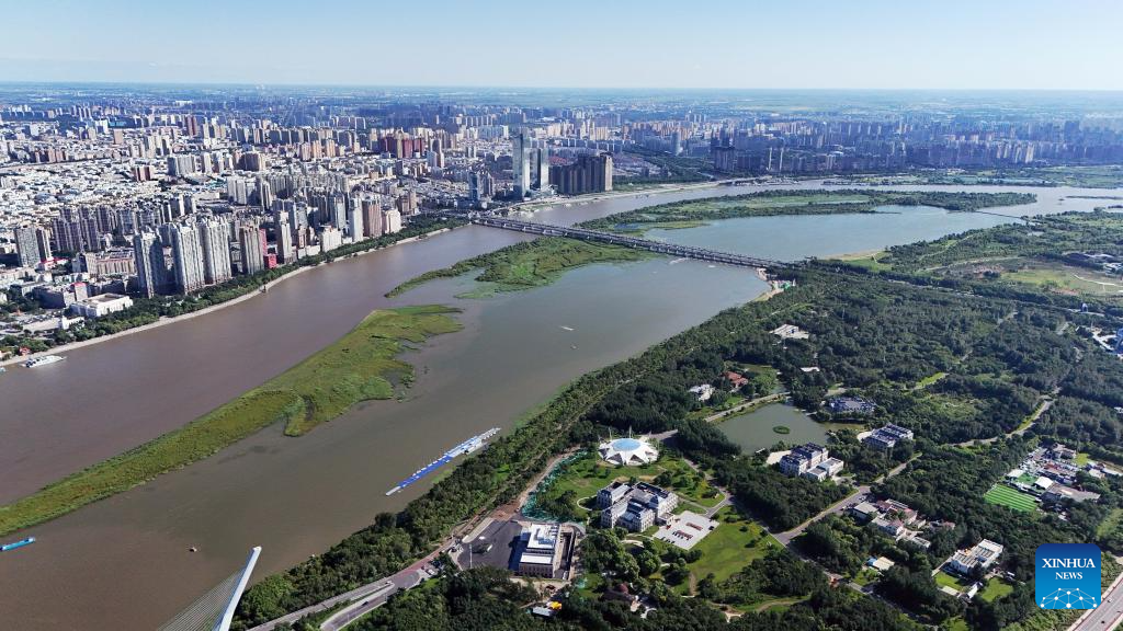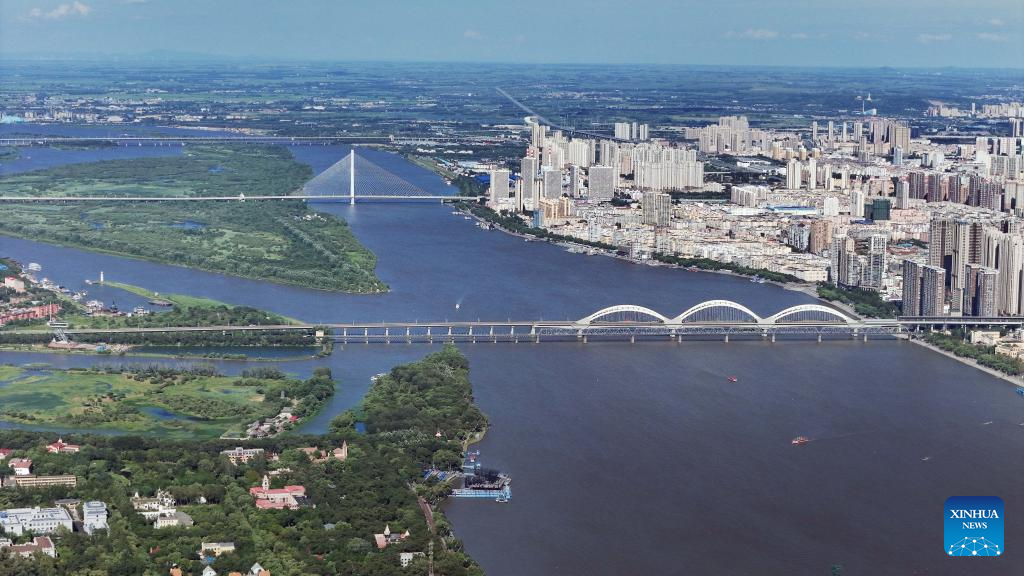 An aerial drone photo taken on July 30, 2025 shows a view of the Sun Island Scenic Area in Harbin, northeast China's Heilongjiang Province. Located on the north bank of the Songhua River in Harbin, the Taiyangdao (Sun Island) National Wetland Park has a wetland area of more than 7,000 hectares, with a high wetland rate of more than 70 percent. Among them, the Sun Island Scenic Area is one of the few riverfront wetland grassland ecological zones lying in the city center in China.