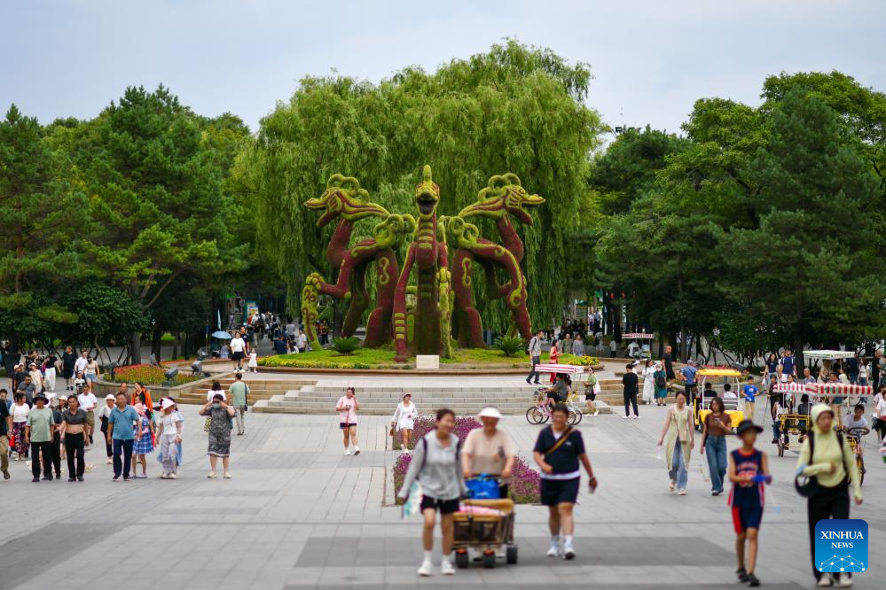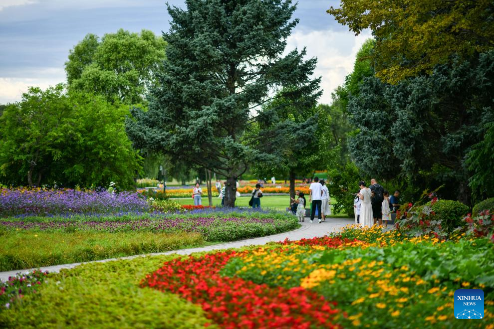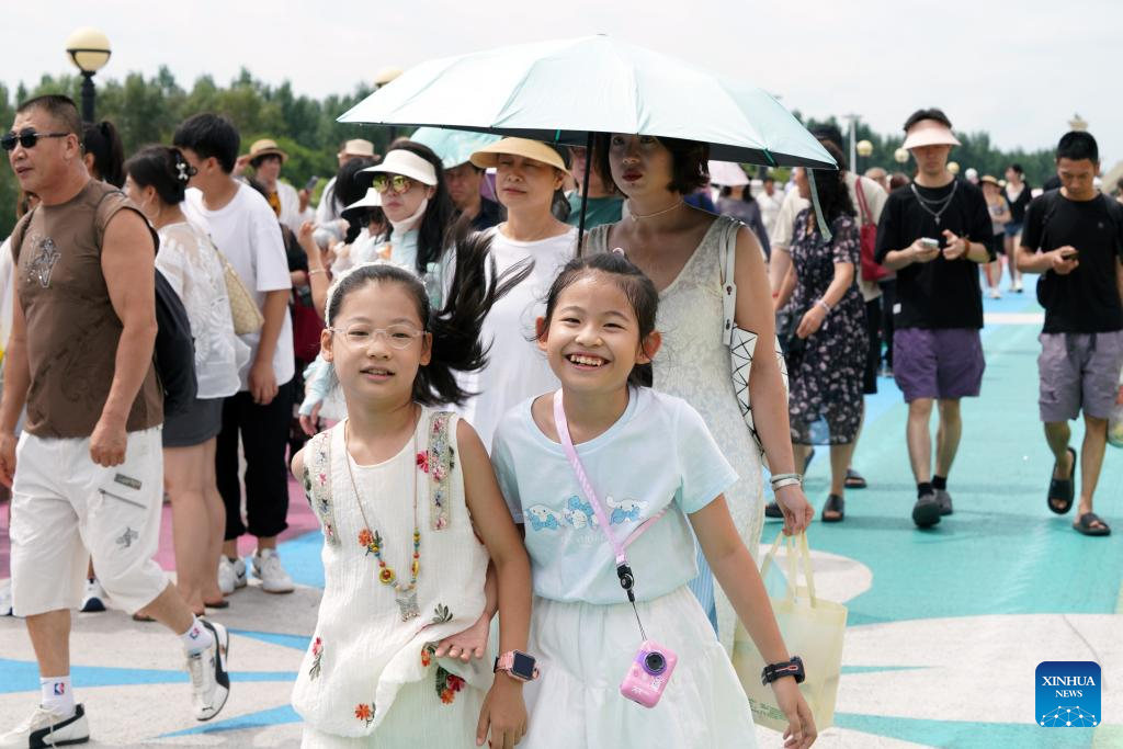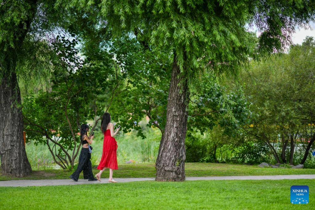 People visit the Sun Island Scenic Area in Harbin, northeast China's Heilongjiang Province, July 31, 2025. Located on the north bank of the Songhua River in Harbin, the Taiyangdao (Sun Island) National Wetland Park has a wetland area of more than 7,000 hectares, with a high wetland rate of more than 70 percent. Among them, the Sun Island Scenic Area is one of the few riverfront wetland grassland ecological zones lying in the city center in China.