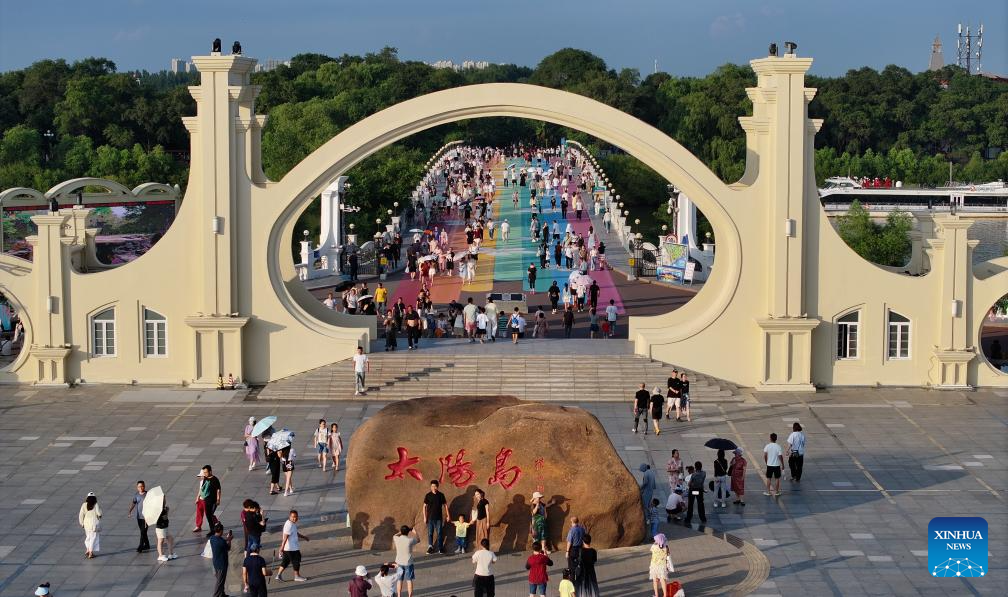 In midsummer, the charming scenery of the vibrant urban ecological island attracts numerous tourists. (Xinhua/Wang Song)