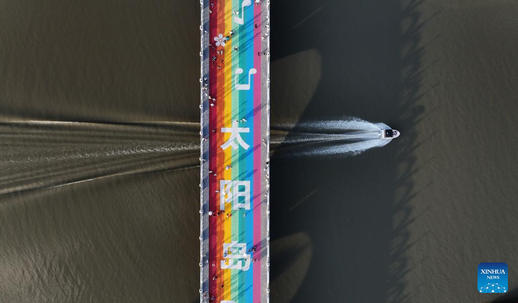 An aerial drone photo taken on July 27, 2025 shows a boat sailing across the "rainbow bridge" leading to Sun Island Scenic Area, in Harbin, northeast China's Heilongjiang Province. Located on the north bank of the Songhua River in Harbin, the Taiyangdao (Sun Island) National Wetland Park has a wetland area of more than 7,000 hectares, with a high wetland rate of more than 70 percent. Among them, the Sun Island Scenic Area is one of the few riverfront wetland grassland ecological zones lying in the city center in China.