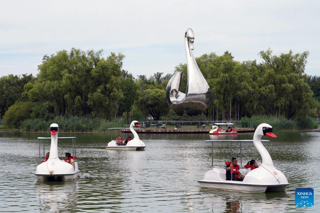 People visit the Sun Island Scenic Area in Harbin, northeast China's Heilongjiang Province, Aug. 1, 2025. Located on the north bank of the Songhua River in Harbin, the Taiyangdao (Sun Island) National Wetland Park has a wetland area of more than 7,000 hectares, with a high wetland rate of more than 70 percent. Among them, the Sun Island Scenic Area is one of the few riverfront wetland grassland ecological zones lying in the city center in China.