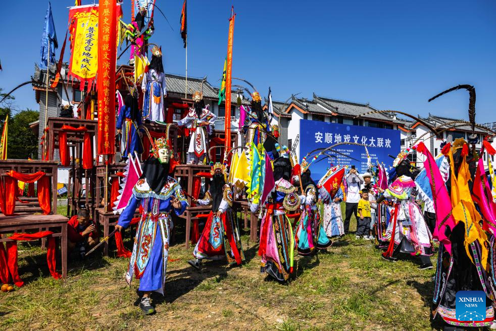 Actors stage a Dixi opera performance at the Miaoling Tunpu scenic area in Xixiu District of Anshun City, southwest China's Guizhou Province, Aug. 2, 2025. Anshun Dixi Opera is an important part of Tunpu culture dating back to the Ming Dynasty (1368-1644). The opera has been listed as a national intangible cultural heritage item in 2006. (Photo by Fan Hui/Xinhua)