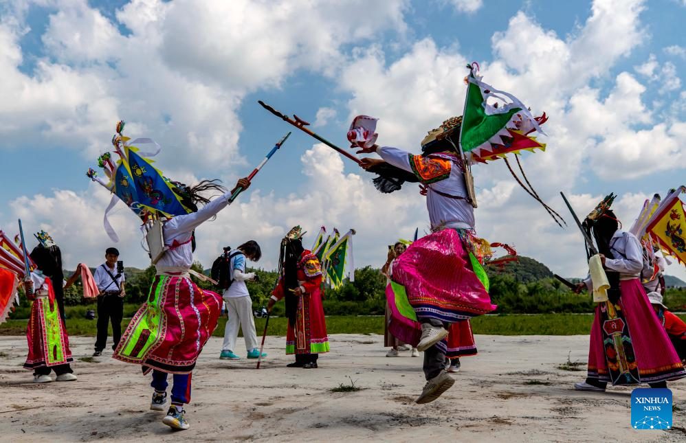 Actors take part in a Dixi opera parade at the Miaoling Tunpu scenic area in Xixiu District of Anshun City, southwest China's Guizhou Province, Aug. 2, 2025. Anshun Dixi Opera is an important part of Tunpu culture dating back to the Ming Dynasty (1368-1644). The opera has been listed as a national intangible cultural heritage item in 2006. (Photo by Fan Hui/Xinhua)